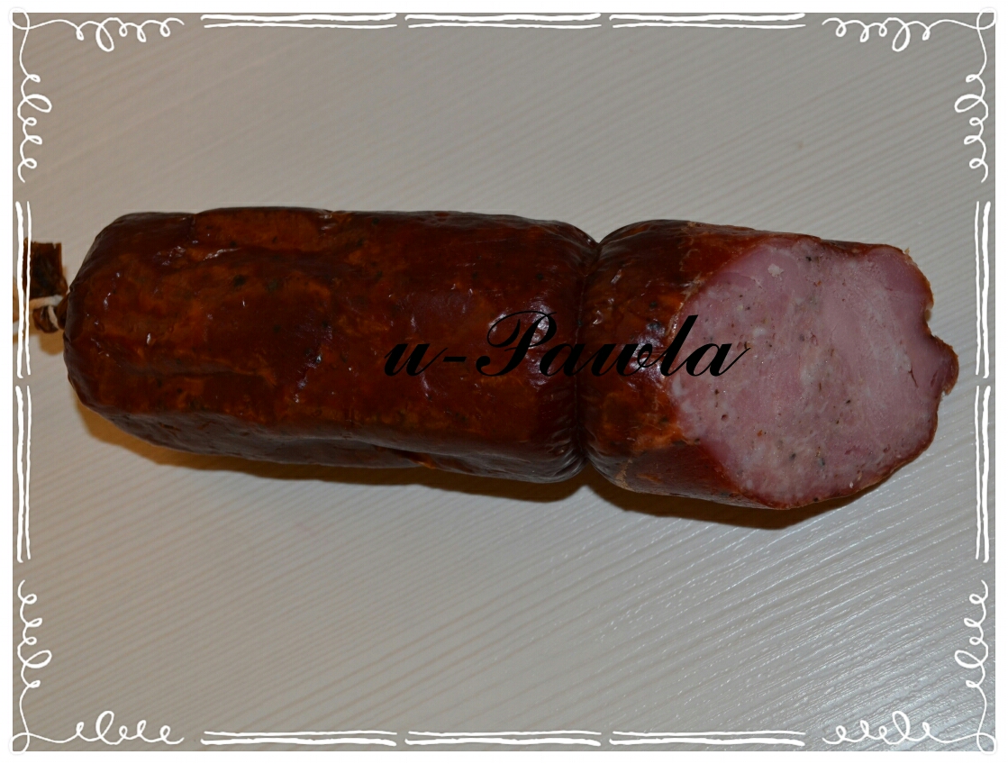 Szynkę dokładnie myjemy, następnie osuszamy i oddzielamy czyste mięśnie od błon i tłuszczu. Mięśnie kroimy w kostkę około 3 cm (to forma która nie będzie już dalej rozdrabniana), a pozostałość w kawałki umożliwiające późniejsze zmielenie. W oddzielnych pojemnikach peklujemy w ilości 18g na każdy kg surowca. Przykryte odstawiamy na dwa dni do lodówki. Po tym czasie mielimy tłustą część w maszynce uzbrojonej sitkiem z najmniejszymi oczkami (u mnie było to sitko makowe 2mm) Mieszamy z zapeklowanym wcześniej mięsem pokrojonym w kostkę dodajemy pieprz i dokładnie mieszamy. Nabijamy w osłonki kolagenowe bardzo ściśle i pozostawiamy do osadzenia na 12-24h. Wędzimy w temperaturze 50-60˚C do uzyskania pożądanego koloru (u mnie trwało to 3,5h). Parzymy w temperaturze 72˚C około 3h. Studzimy i odwieszamy w przewiewnym miejscu na kilka dni do podsuszenia.